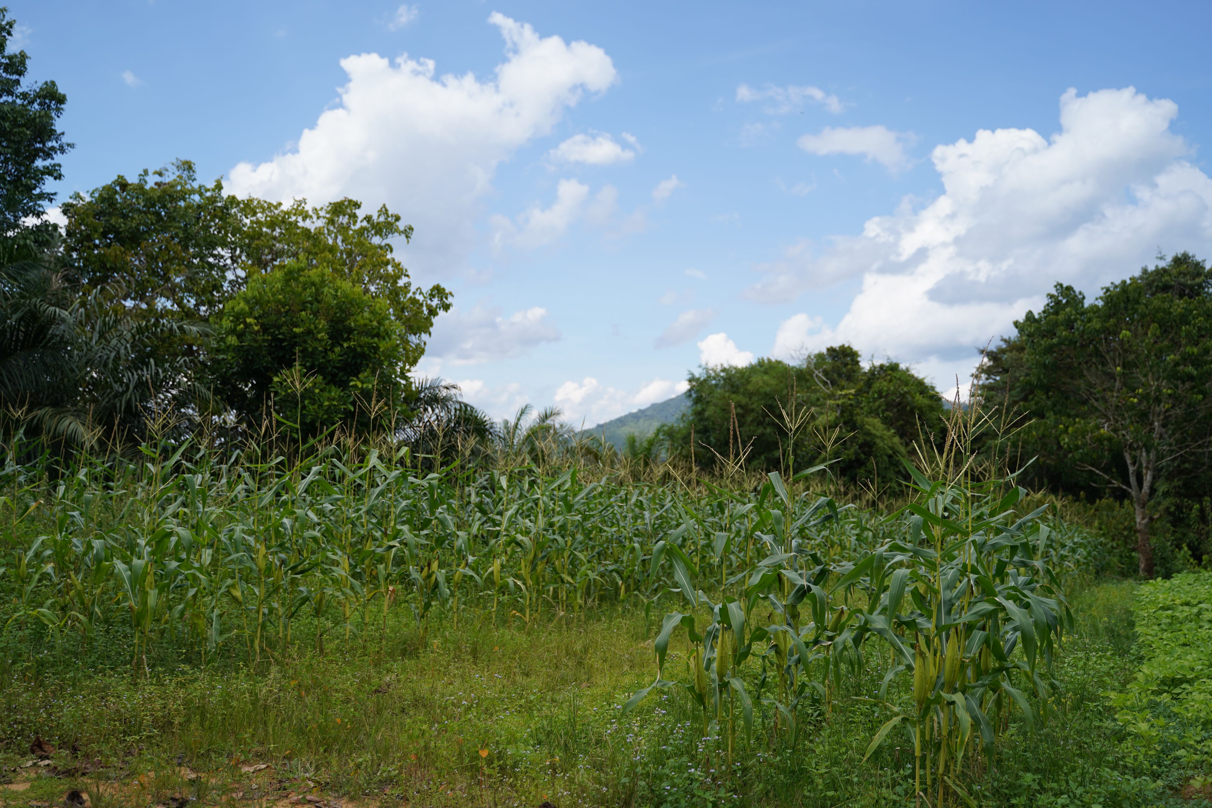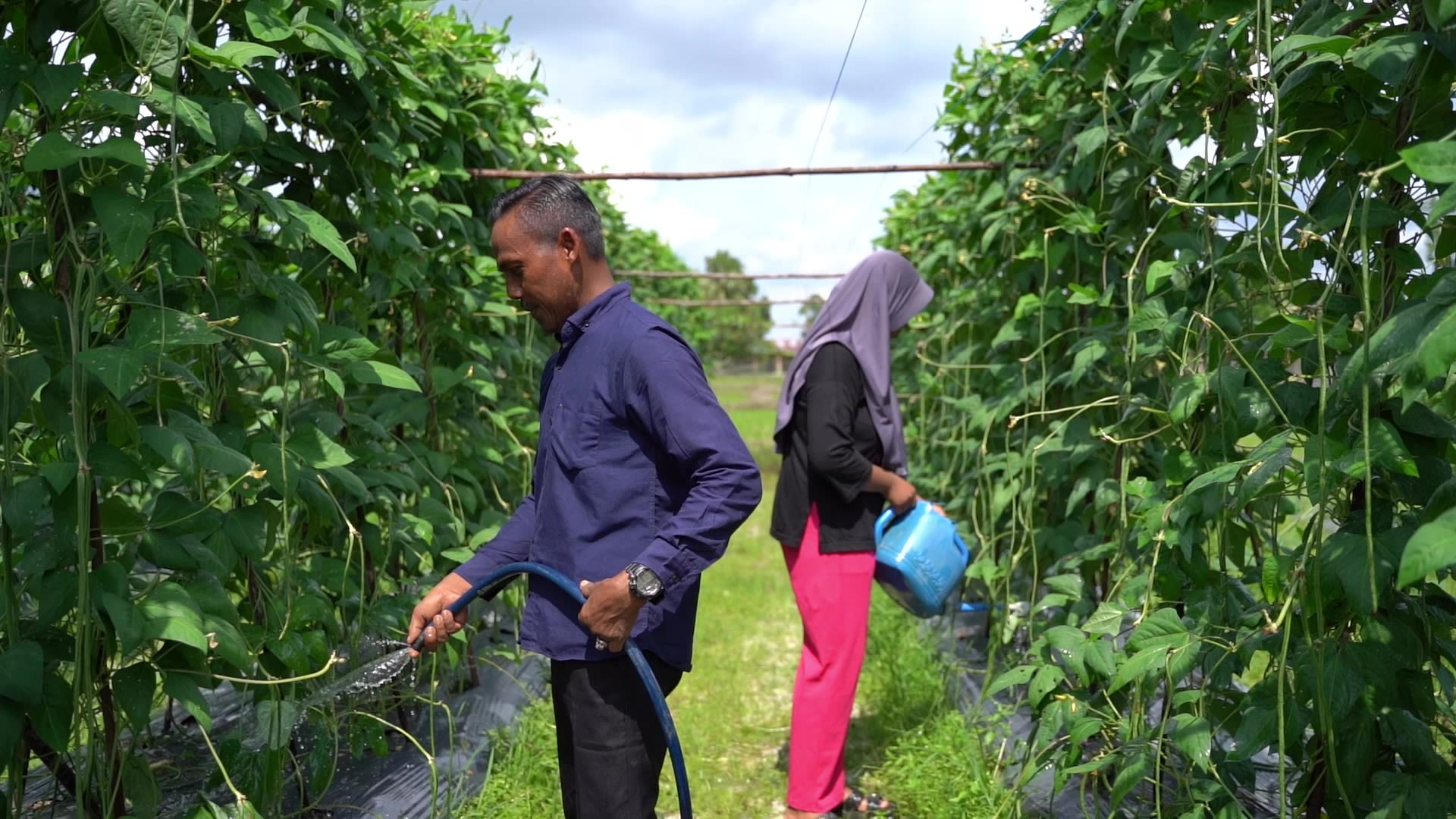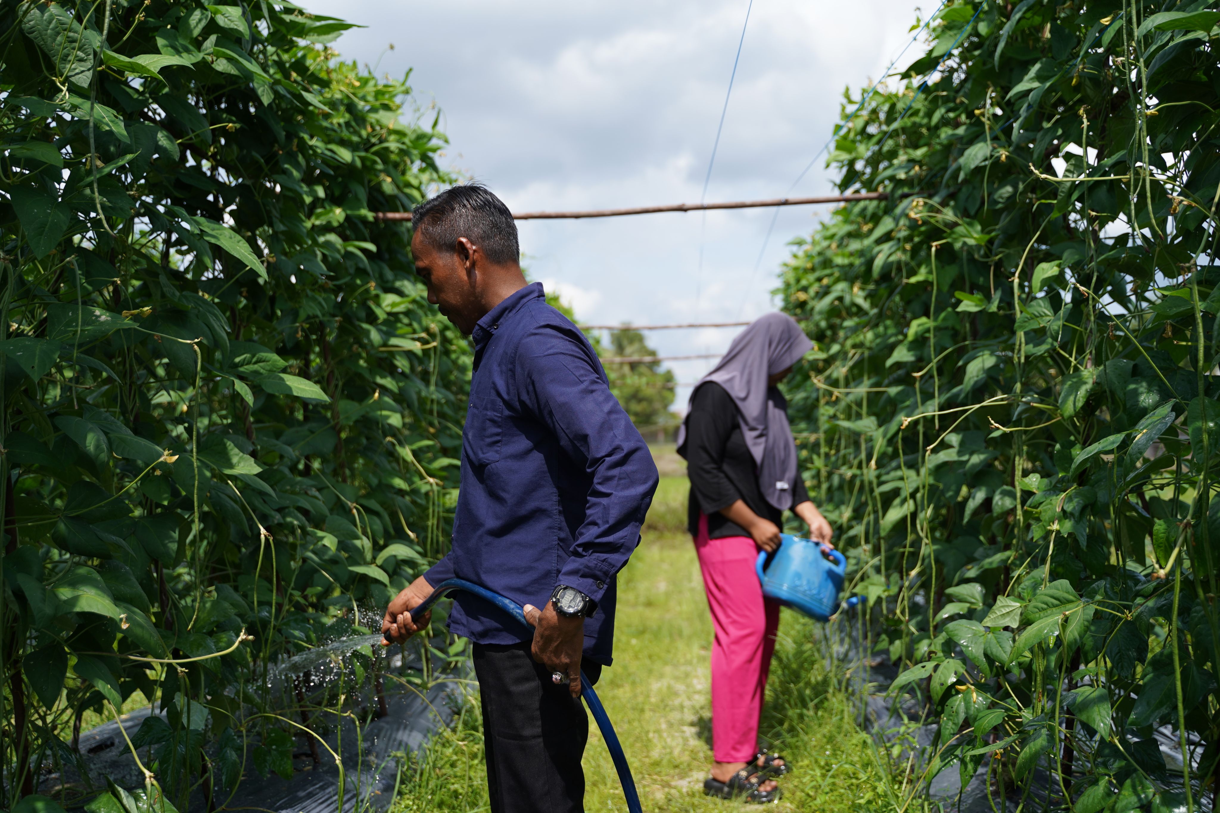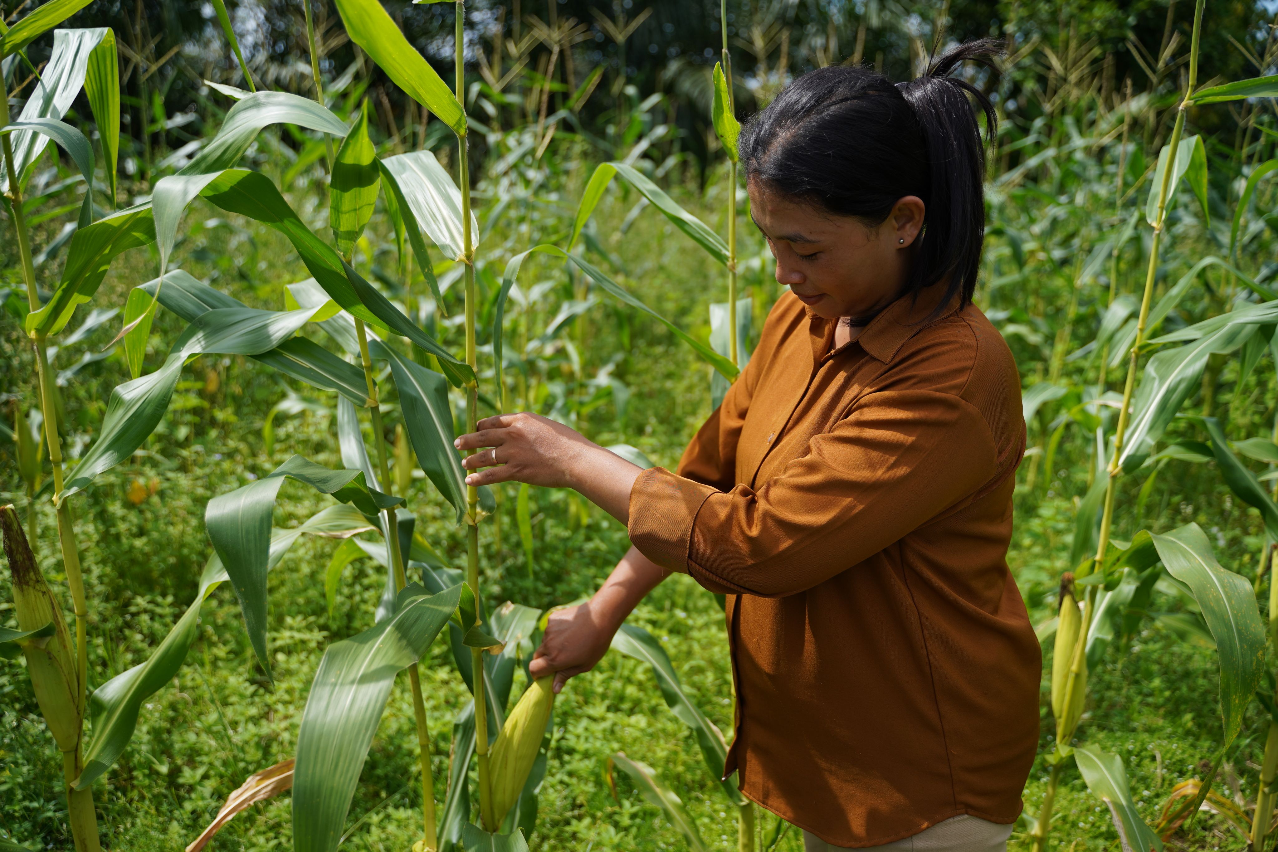 In a small plot in the village of Lubuk Tajau, women weave in and out of rows of corn, spinach, morning glory, and watercress in the heat of the day. They water the crops with water from the community tap installed by Wahana Visi Indonesia.