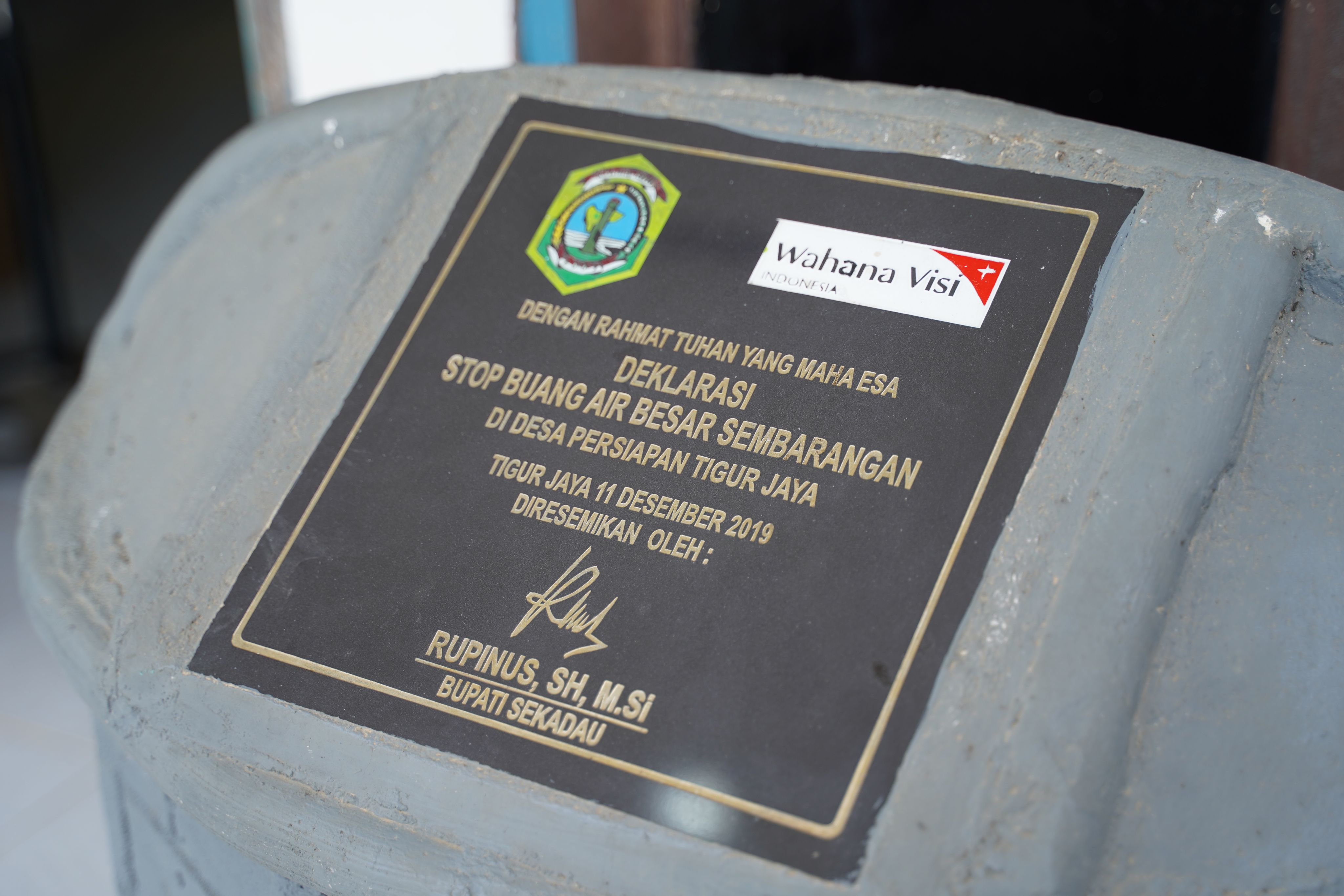 A plaque installed by the district government reads, "By the Grace of Almighty God, Declaration to Stop Open Defecation in the Preparatory Village of Tigur Jaya, December 11, 2019."