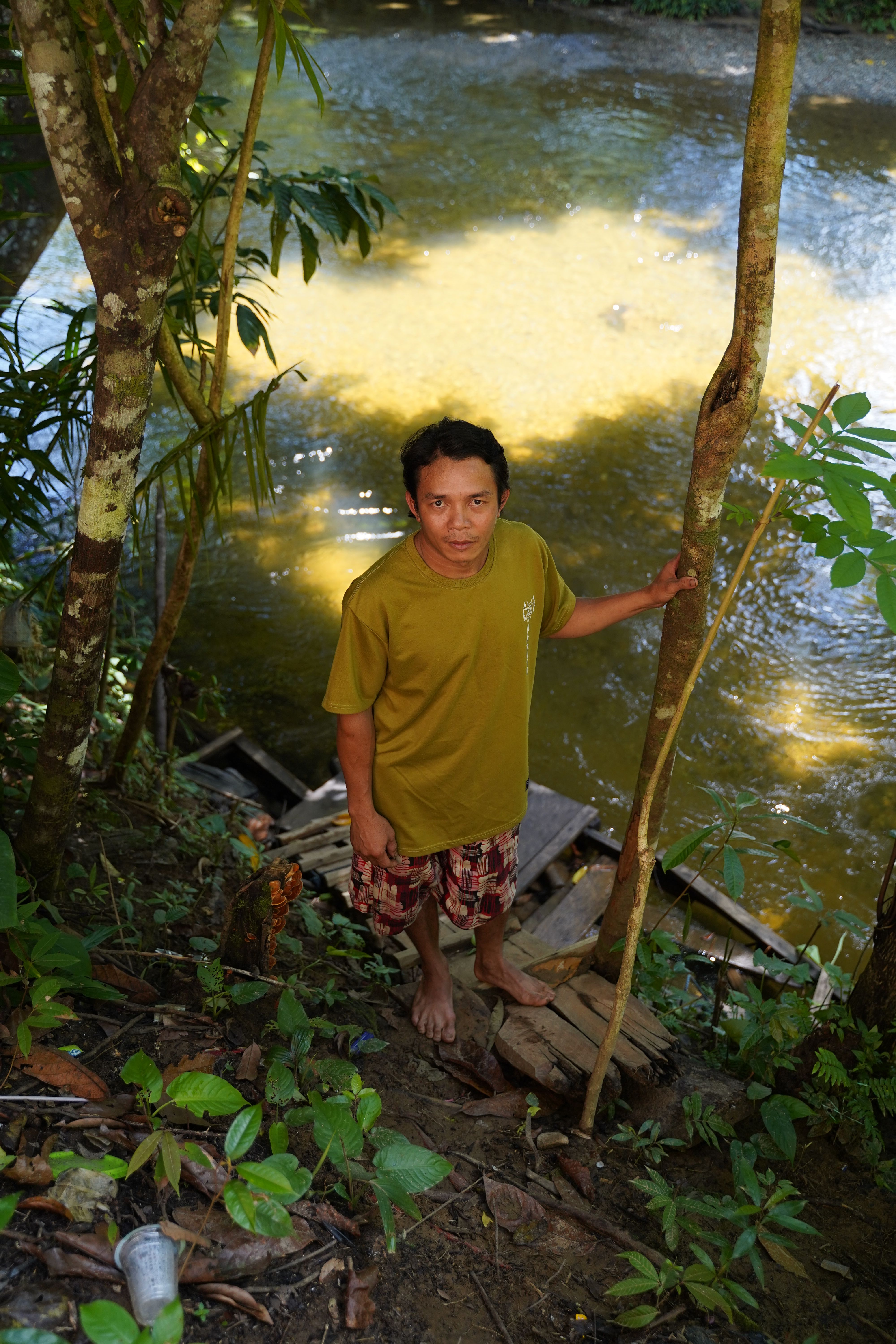 Rizal stands next to the Kapuas River, the longest river in Indonesia, outside his home.